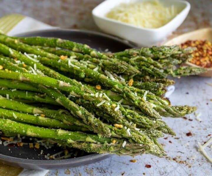 These crispy coated asparagus spears take just a few minutes in the air fryer. They're low in carbs and gluten-free and make a delicious side dish or a tasty snack.