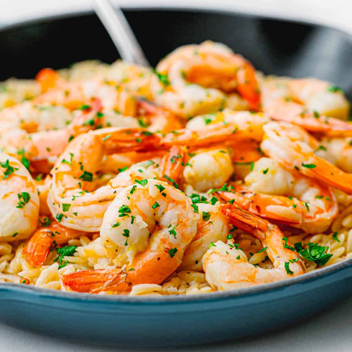Scampi is a classic Italian-American dish featuring shrimp sautéed in lemon and garlic butter. This shrimp scampi is a quick and easy one-pot meal, served over buttery orzo pasta with a fresh lemon flavor. Get the recipe: Shrimp Scampi with Orzo
