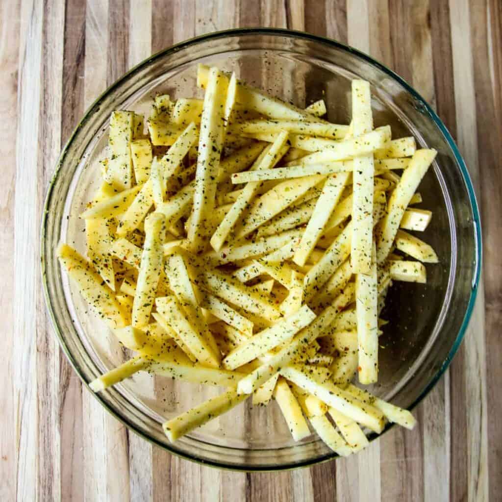 Next, toss the rutabaga fries with oil and seasoning in a large bowl.