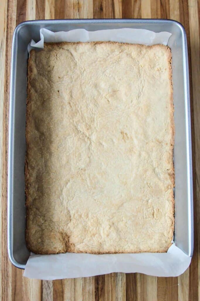 - Line your baking pan with parchment, leaving a couple of inches of overhang. This will make it easy to lift the uncut squares out of the pan. Use a knife first to loosen the sides.