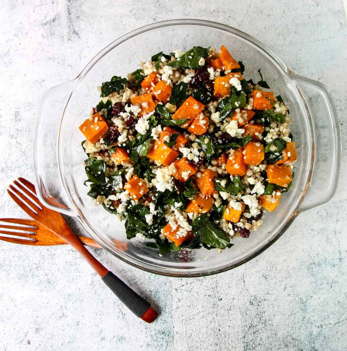 - Add the cooled butternut squash, cooked buckwheat, kale, cranberries, and feta cheese. Toss gently to combine.