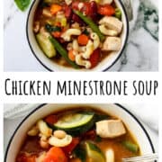 Chicken minestrone soup takes minestone, everyone's favorite Italian soup, from a light meal to a hearty one. With tender chicken and delicious vegetables, this delicious, comforting soup is easy to make. Just one pot, and cooks in thirty minutes.