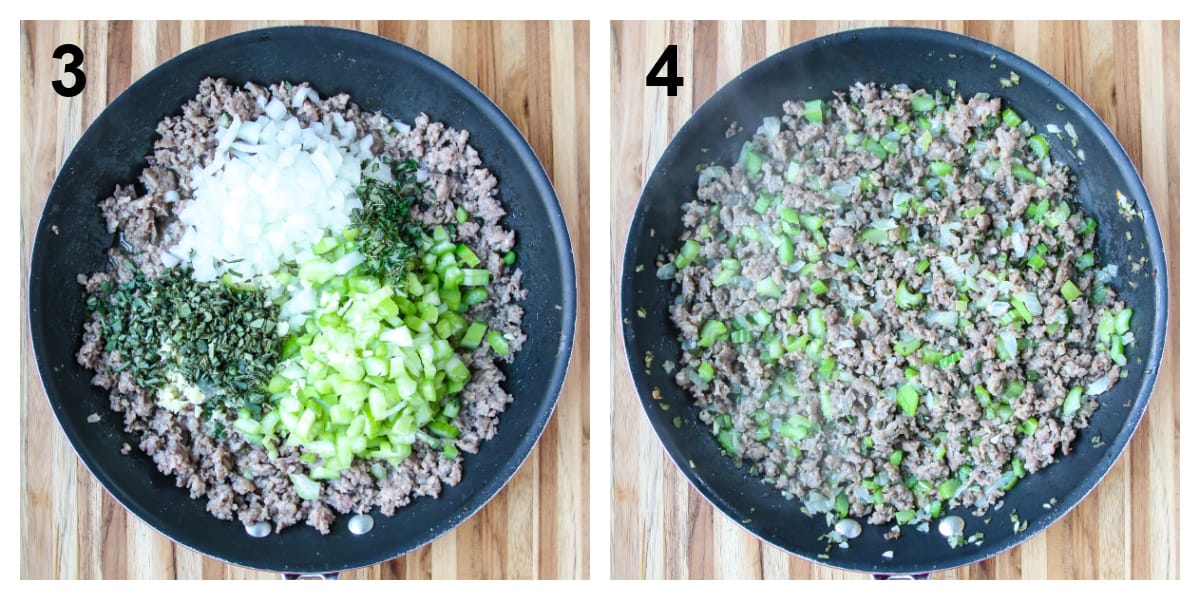 - Add sausage, onion, celery, garlic, sage, and thyme. Cook, breaking up sausage with a spoon, until sausage is browned and vegetables are softened, about 10 minutes.