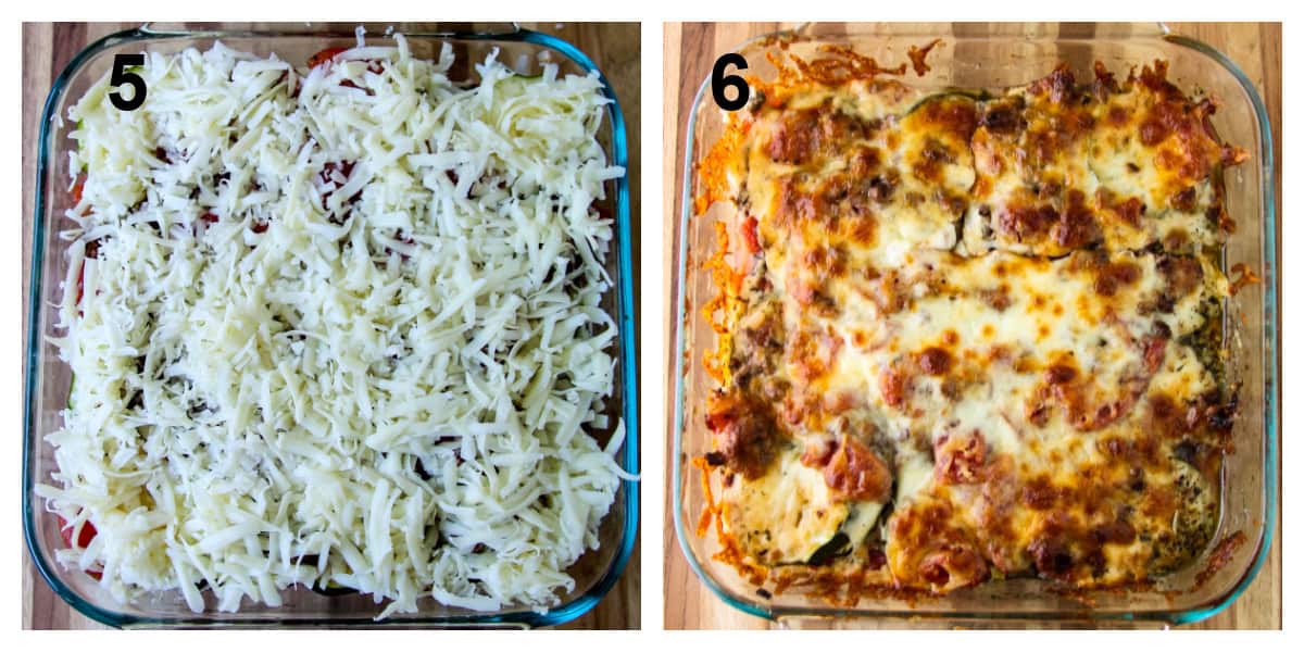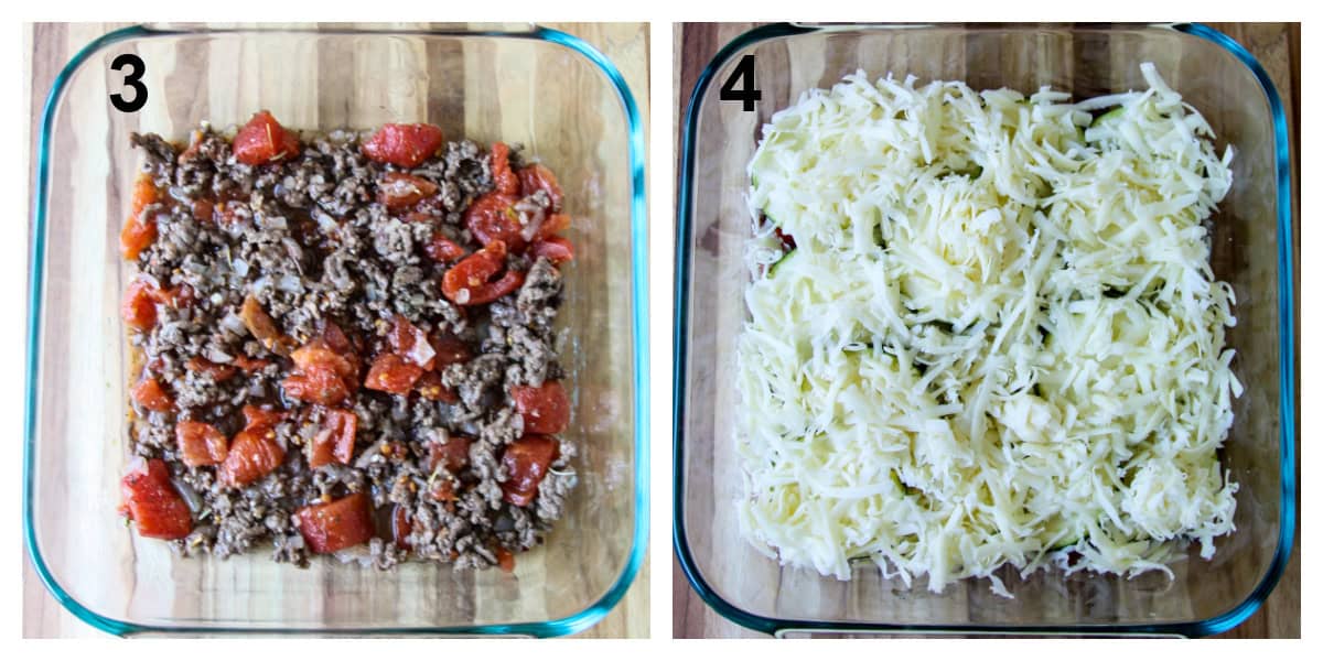 - In an 8x8 baking dish, spread half of the ground beef mixture. Cover with half of the zucchini slices, then half of the mozzarella cheese.