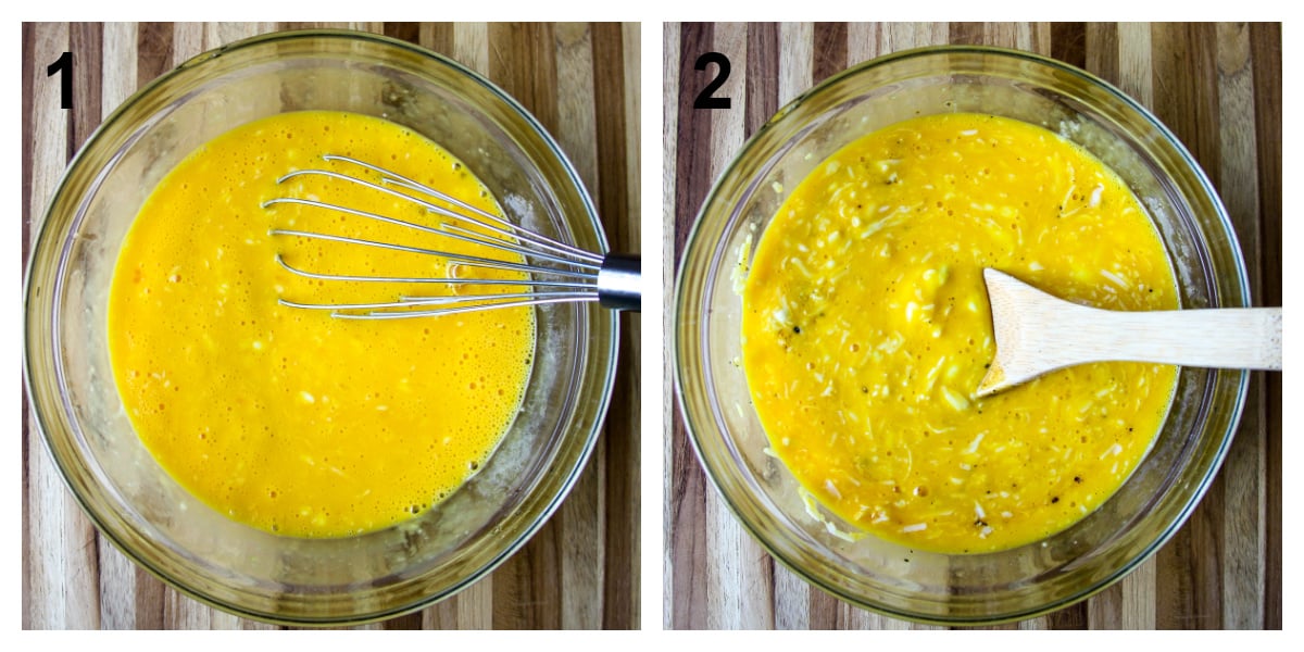- In a large bowl, whisk the eggs just until the yolks and whites are combined. Stir in the yogurt, mozzarella cheese, parmesan cheese, salt, and pepper into the eggs.