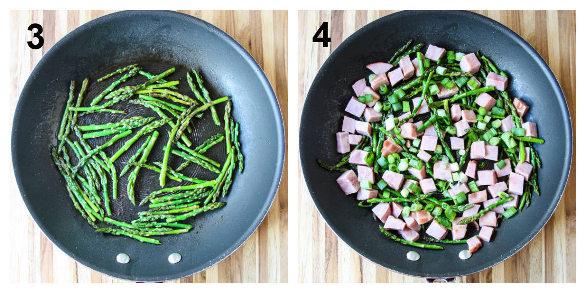 - Over medium heat, heat the oil in an oven-safe skillet. Add the asparagus and saute until the asparagus is tender-crisp. Add the chopped ham and green onions.