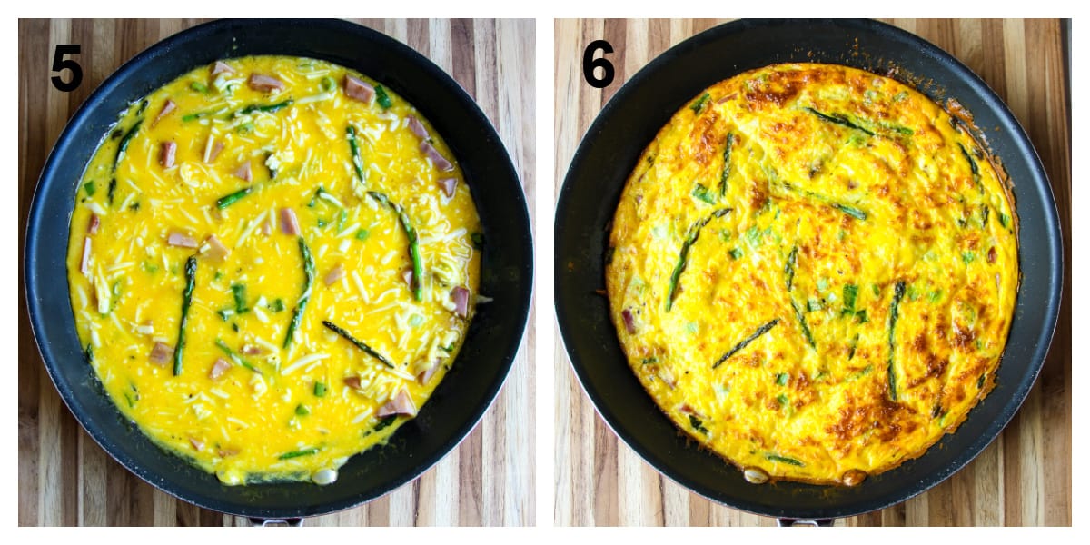 - Pour the egg mixture into the skillet, stirring the asparagus and ham to arrange evenly.