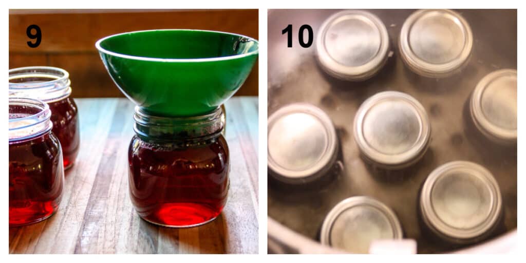 - Quickly pour jelly into sterilized jars, (eight 8 ounce jars) wiping the rims with a damp paper towel. Center lids on jars and secure rims to finger tight.