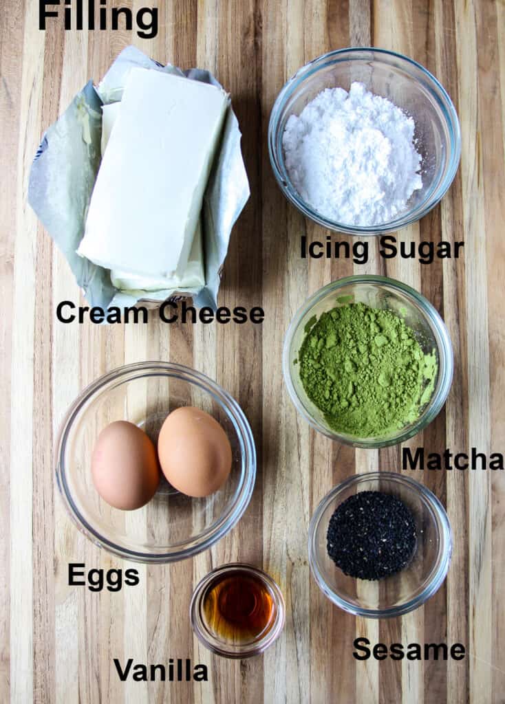 - In the bowl of a stand mixer or with an electric beater, (or a food processor) combine cream cheese, eggs, and sugar and beat until smooth. Add vinegar, vanilla, and matcha powder and beat until combined.