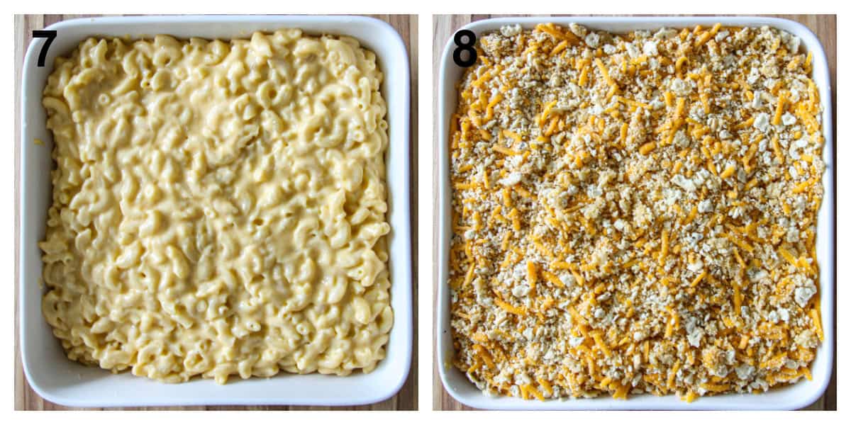 - In a small bowl, stir together the crumbs and reserved shredded cheese with melted butter. Spread the crumb mixture evenly over the macaroni and cheese.