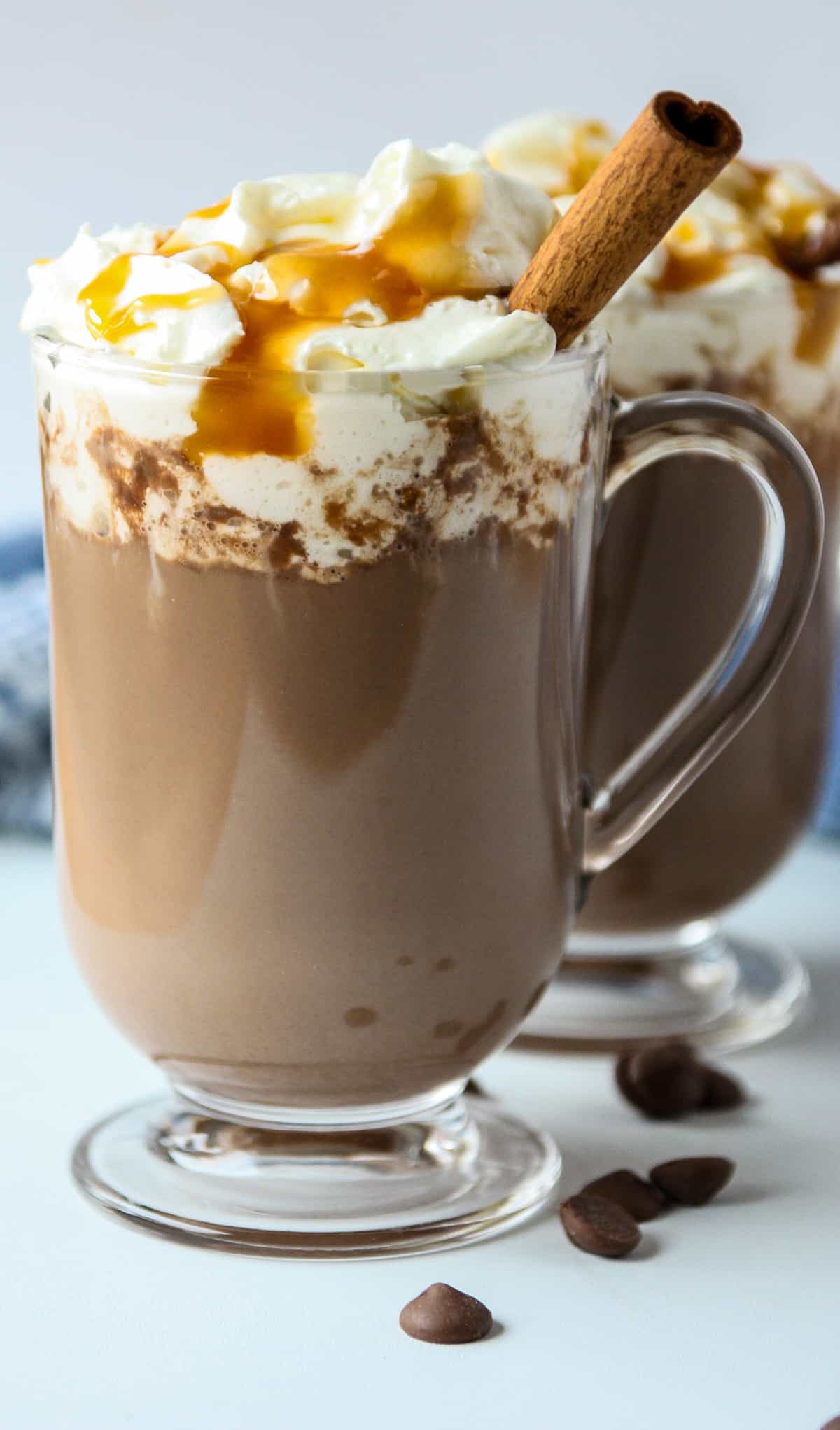 - Pour the hot chocolate into two mugs, then top each one with whipped cream (or marshmallows), caramel sauce, or any other garnish you prefer. Serve the drinks with cinnamon sticks.