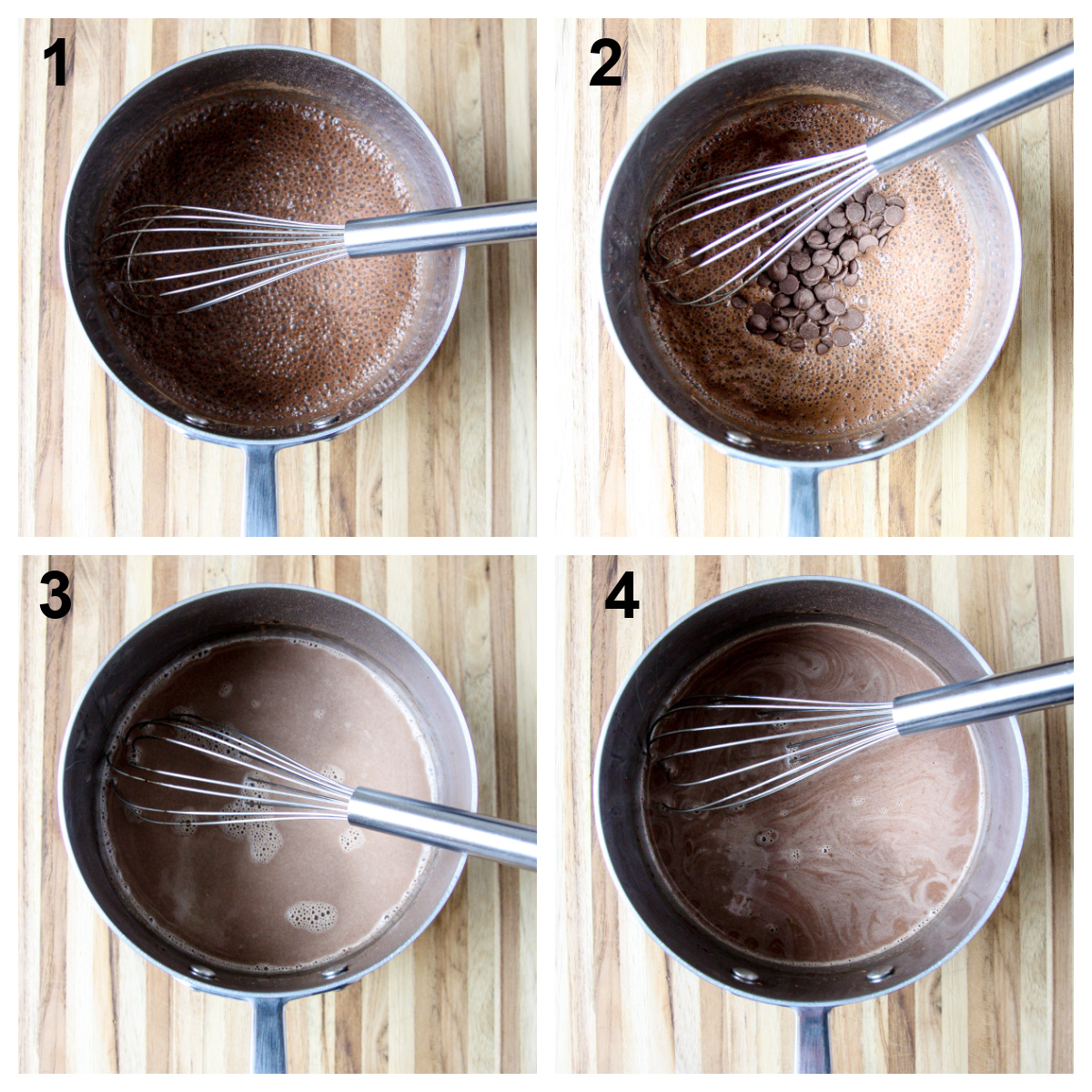 - In a small saucepan, whisk together the milk, cocoa powder, salt, and vanilla until the mixture is smooth.