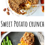 Serve your sweet potato crunch with other side dishes like gluten free cornbread dressing, brown sugar Brussels sprouts, mashed potato squash, or honey roasted carrots and parsnips.