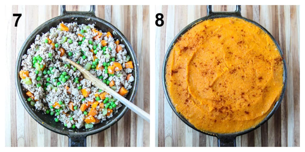 - Using a spatula, smooth the mashed sweet potatoes over the filling evenly to cover.
